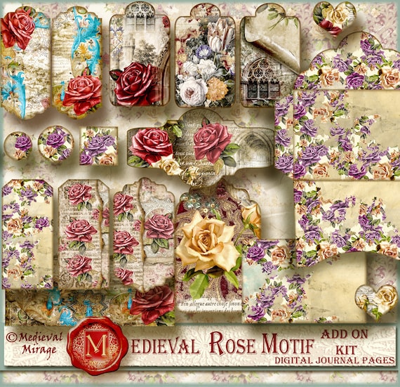 MEDIEVAL ROSE Motif VOL 2. Digital Junk Journal Kit. Venice, castle, manuscript, vintage roses, rustic, gothic grunge, distressed, antique.